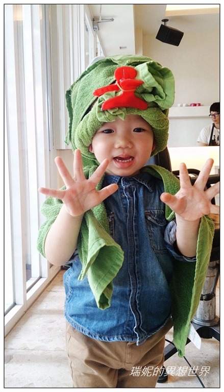 上好了第一劑藥水因為不用烘,所以小孩就可以下來放風了!整顆頭被包的好像肉粽,這小孩還這麼開心!(老木偷笑中)