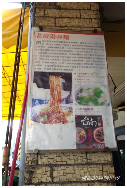瑞妮的大弟這周要到南部參加喜宴,所以昨天順道來台南找阿寄遊玩,身為任重道遠的大姊當然不能讓弟弟和弟妹還有小姪女失望,吃吃喝喝的行程都得派出心中的王者,這樣食慾的滿足程度才能讓一路從台北殺到台南的他們盡興而歸,也因為老弟對台南的牛肉湯情有獨鍾,自從上次在台南喝了第一碗牛肉湯,就在心裡發誓這趟要喝牛肉湯喝到飽,所以本來周六的第一站是打算衝育樂牛肉湯,但是因為時間有些耽擱所以抵達台南時已經下午兩點了,完全錯過育樂牛肉湯的營業時間,只好含淚放棄。不過台南美食何其多,雖然已經過了用餐時間但是小吃之都也不是叫假的,最後在一陣討論之下決定先殺去瑞妮的愛店之一 : 老黃陽春麵。