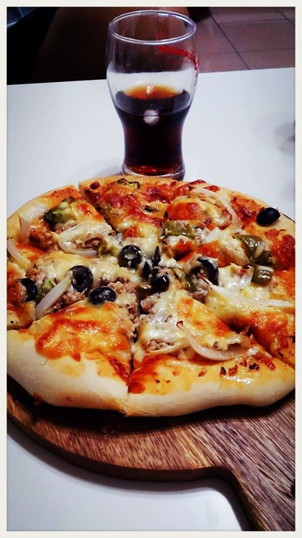 鮪魚洋蔥手工pizza。第二顆手工匹薩,有鑑於第一顆味道的簡單,這一顆放了比較多的乳酪絲和料,所以整體味道較為豐富美味,不過可能也因為放了大量的鮪魚所以吃起來也比較油些,不過老公仍是比較偏愛這顆的味道,好粗好粗,美味的手工pizza搭上冰涼的可樂,美好的幸福不過如此簡單而已。